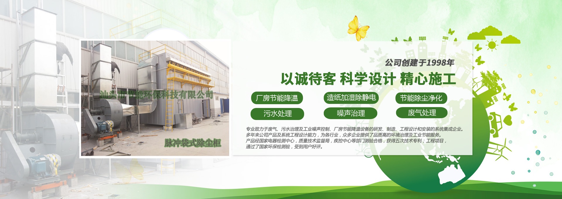 汕頭市節(jié)能環(huán)??萍加邢薰緞?chuàng)建于1998年,是一家專業(yè)致力于廢氣、污水、粉塵、噪聲治理,廠房節(jié)能降溫設(shè)備的研發(fā)、制造、工程設(shè)計和安裝的系統(tǒng)集成企業(yè)。多年來公司產(chǎn)品及系統(tǒng)工程設(shè)計能力,為各行業(yè),眾多企業(yè)提供了品質(zhì)高的環(huán)境治理及工業(yè)節(jié)能服務(wù)。產(chǎn)品經(jīng)國家電器檢測中心,質(zhì)量技術(shù)監(jiān)督局,疾控中心等部門測驗(yàn)合格,獲得五次技術(shù)專利;工程項目通過了國家環(huán)保檢驗(yàn)檢測,受到用戶好評。